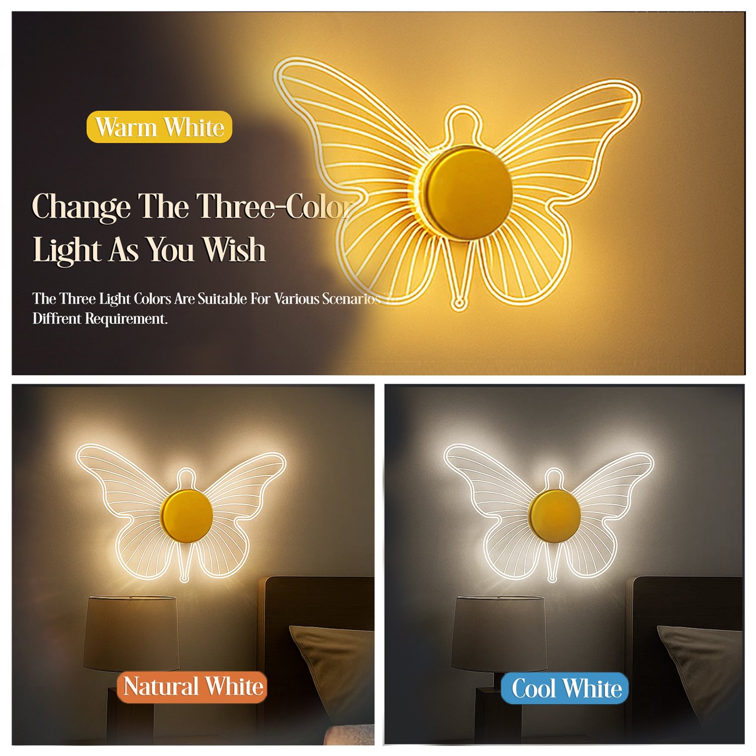 Golden Butterfly LED Wall Light – 3 Color Modes